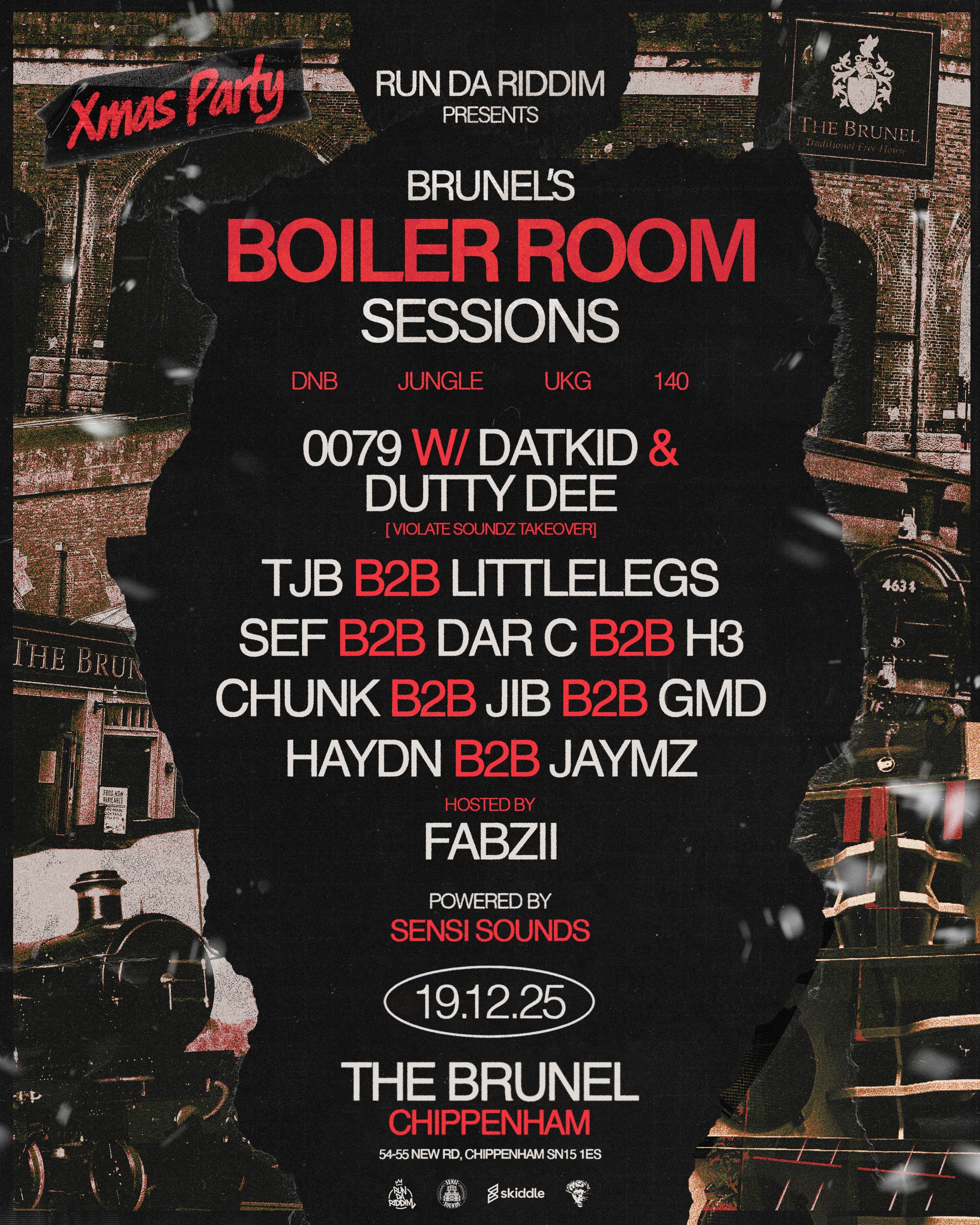 Run Da Riddim return for a multi-genre Xmas Party at The Brunel, Chippenham where you can expect Garage | 140 | DnB | Jungle powered by Sensi Sounds.